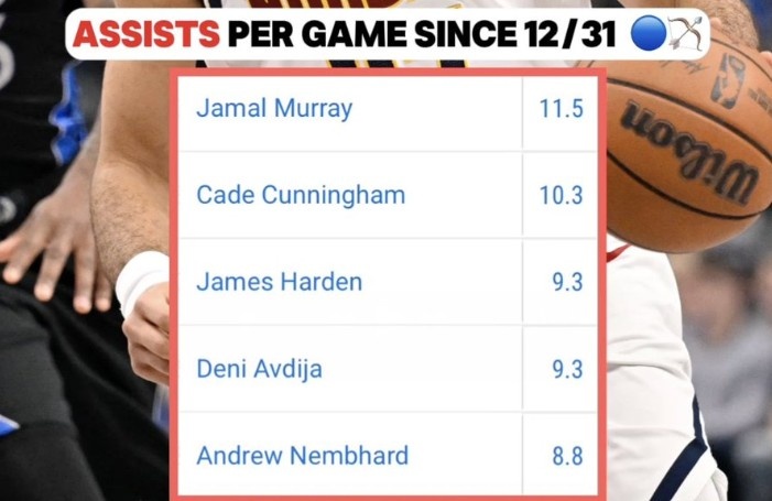 据统计,自约基奇受伤以来,穆雷场均可以送出11.5次助攻,同期联盟最多。